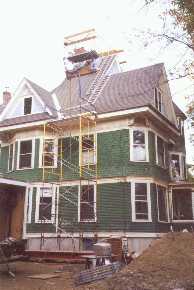 Chimney Works sets up staging for roof and chimney access.